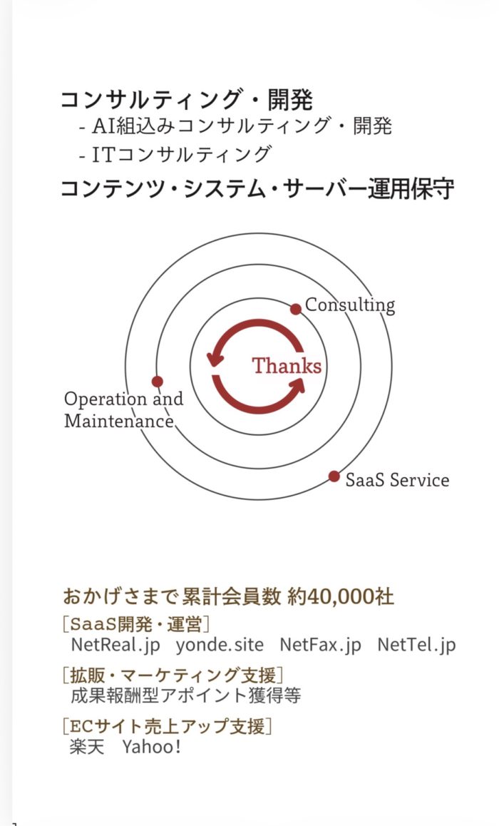 名刺を一新しました 今週裏面を一新しました名刺が届きました。添付の画像がその裏面デザインです。これまでは、www.NetReal.jpのことを中心に案内を記載していたデザインでしたが、その内容は下段3割ほどに収め、多くのスペースはITコンサルティング、AI組込みコンサルティング・開発をしていることを認識してもらう案内に変えました。これまでの私の活動はネットリアルを知って頂くことでしたが、今後は業務効率化や収益アップニーズを開拓していくことに変わります。 Screenshot